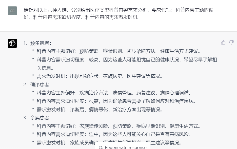 2、请针对以上六种人群,分别给出医疗类型(XXX类型/方向/主题)科普内容需求分析,要求包括:科普内容主题的偏好、科普内容需求迫切程度、科普内容的需求激发时机